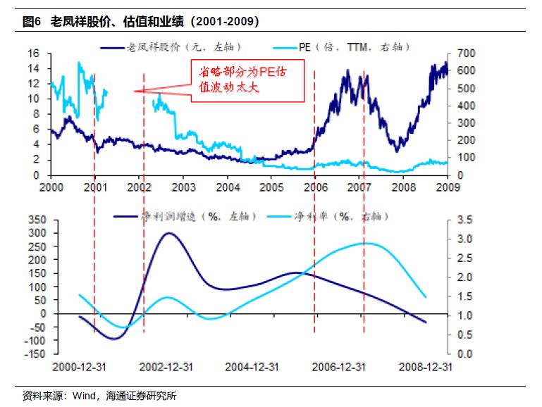 (1)1992-2000年(图5):公司1992年8月14日上市,上市前几年净利润保持稳定增长,净利率也保持在20%以上(至1998年),股价也稳定增长;1999年净利增速和净利率大幅下降,主因收购了老凤祥有限50.4%股权,涉足了黄金珠宝业务,同时致使2000年估值大幅提升,股价也在该年涨了62%,这段股价上涨主要是估值驱动。